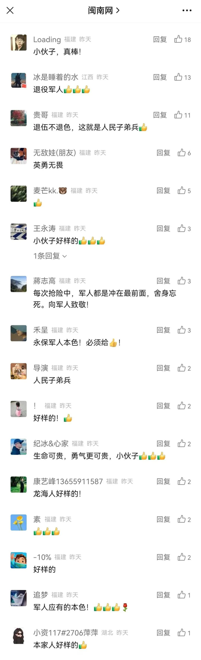 “同是漳州老乡 同是退役军人 为你点赞!”