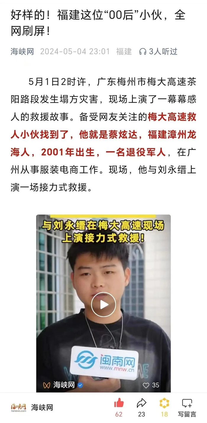 截至目前,《漳州人00后蔡炫达,与刘永缙在梅大高速现场上演接力式救援!》视频网络播放量超过355万,数以万计网友点赞。