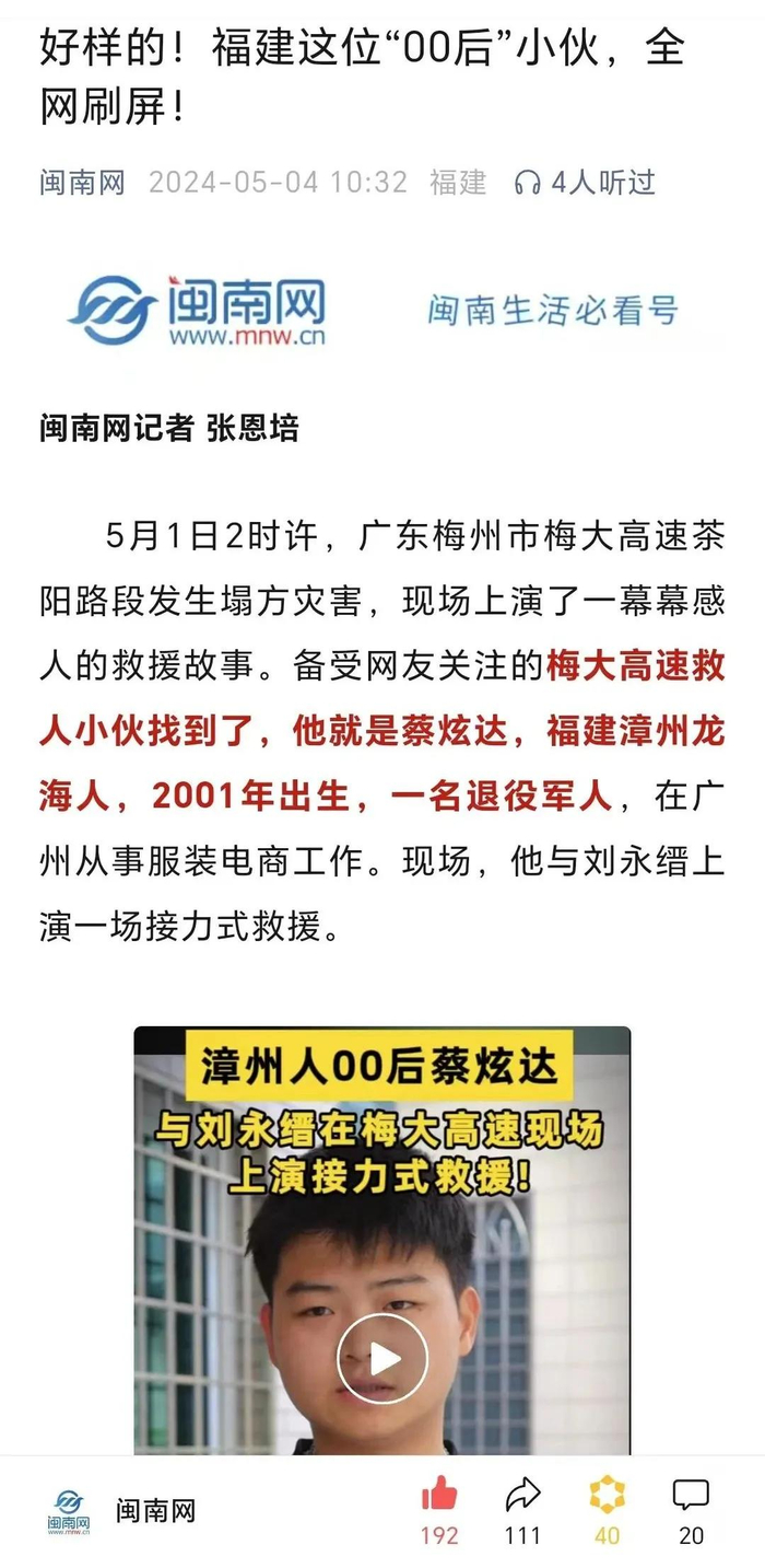 5月3日采访蔡炫达的救人事迹后,东南网、闽南网、海峡网等推出《好样的!福建这位“00后”小伙,全网刷屏!》《视频丨梅大高速救人小伙找到了,福建漳州人00后!退役军人!》《漳州人00后蔡炫达,与刘永缙在梅大高速现场上演接力式救援!》等报道,受到众多媒体的关注、转载。