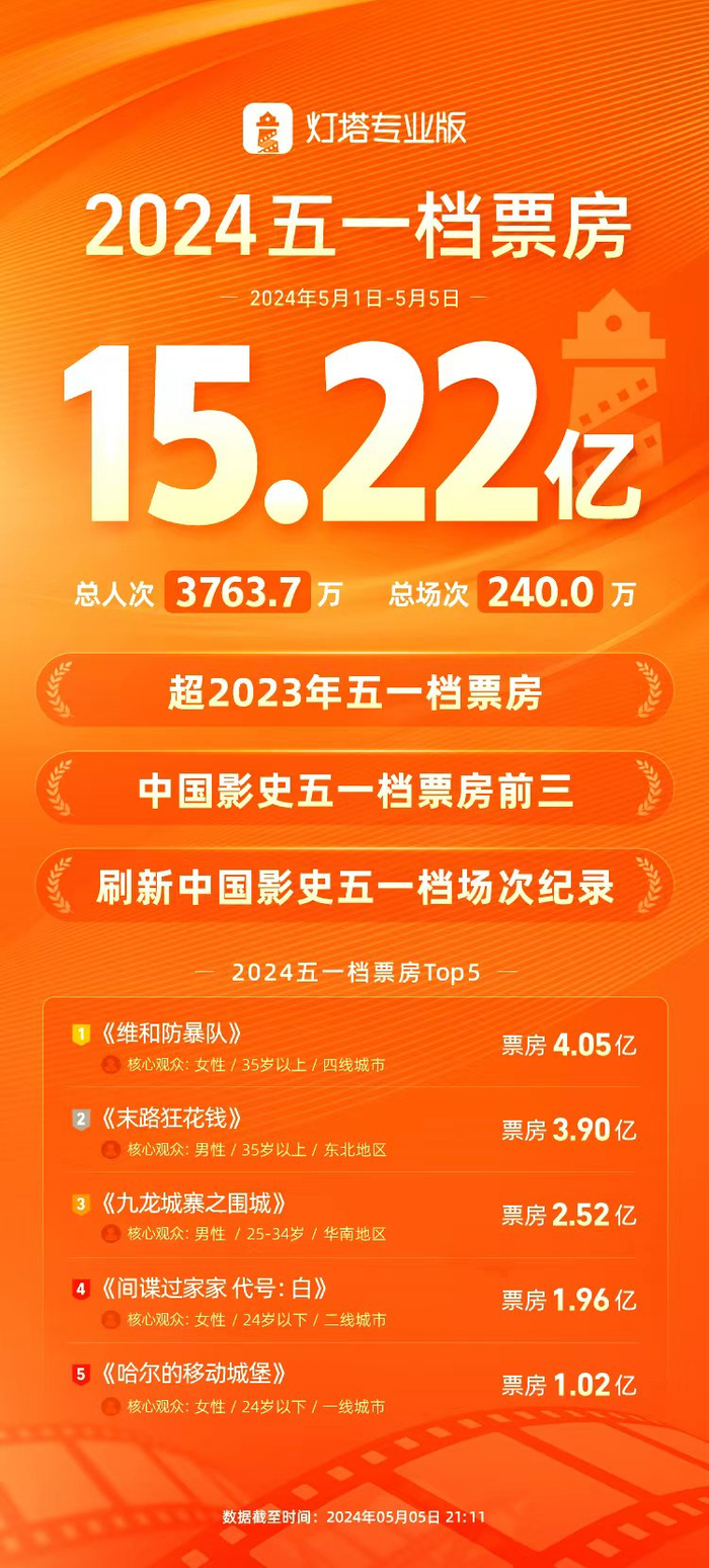 据灯塔专业版,截至5月5日21时11分,2024五一档(5月1日-5月5日)档期内票房已超过15.22亿,超过2023年五一档票房(15.21亿),同时进入中国影史五一档票房前三。
