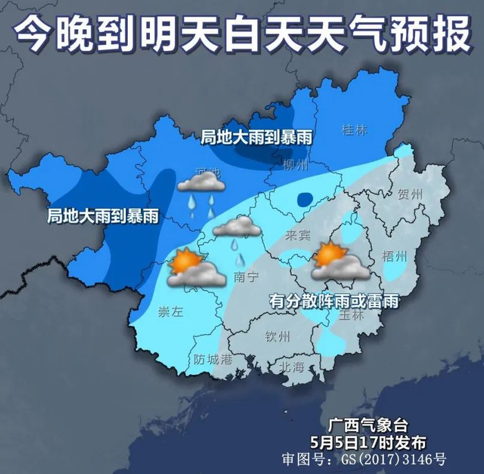 5日晚上到6日白天,百色、河池、柳州、桂林、崇左等市多云到阴天有小到中雨、局地大雨到暴雨,其他地区多云有分散阵雨或雷雨。