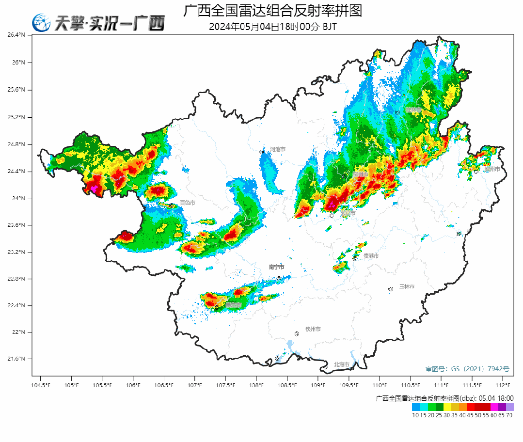 6日晚上到7日白天,桂北、桂东有中雨、局地大雨到暴雨并伴有短时雷暴大风、冰雹等强对流天气,其他地区多云到阴天有阵雨或雷雨、局地大雨。