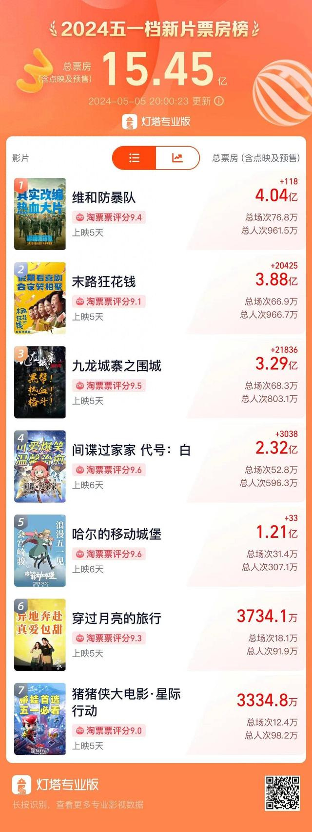 据灯塔专业版数据,截至5月5日20点,2024年五一档总票房(含点映及预售)达15.45亿,档期市场表现优异,多部影片票房超预期,尤其领跑的《维和防暴队》,票房已破4亿,成绩亮眼。整体来看,动作片和喜剧片仍是档期刚需。