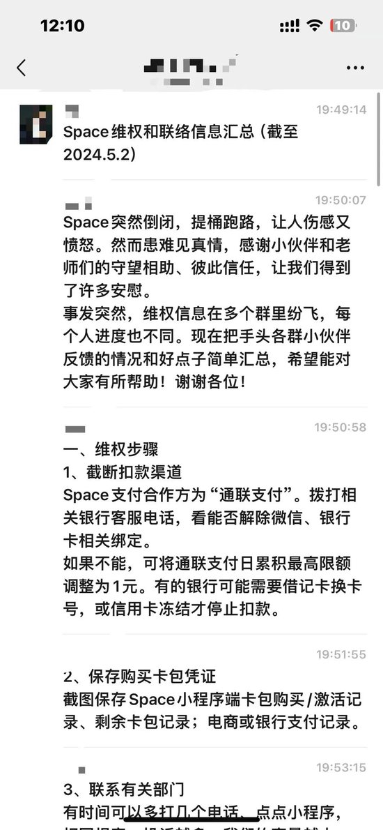 据多位会员介绍,4月30日Space还在正常上课,没想到晚上就发了闭店公告。当天教练还都在正常上课,还在计划五一的课程,没想到一夜之间就倒闭了。Space北京国贸店的会员Sally至今依然觉得不可思议,至今她还有20多课时的课包没有消耗,价值超5000元,“不过我这个损失已经算小的了,我们维权群还有很多年卡用户,最惨的一个会员刚开年卡不到三天,损失上万。”