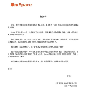 4月30日晚,定位精品高端健身房的SPACE向会员及物业方发布《告知书》,宣布旗下所有门店将在5月1日起停止运营,公司将依法进入清算状态。5月1日,包括北京国贸SPACE等门店的物业方发布通知,宣布门店闭店。按照公告,SPACE选择闭店清算,是公司股东做出的一致决定。