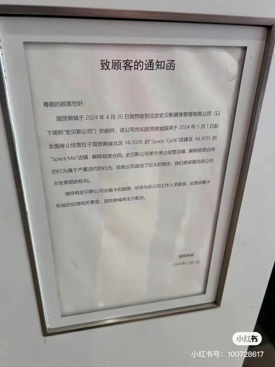被“断崖式分手”的除了会员还有租赁场所,根据国贸商场的通知函,该商场也是4月30日收到的通知,“史贝斯公司单方停止经营店铺、解除租赁合同的行为属于严重违约的行为,给我公司造成了巨大的损失……”