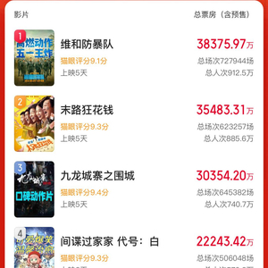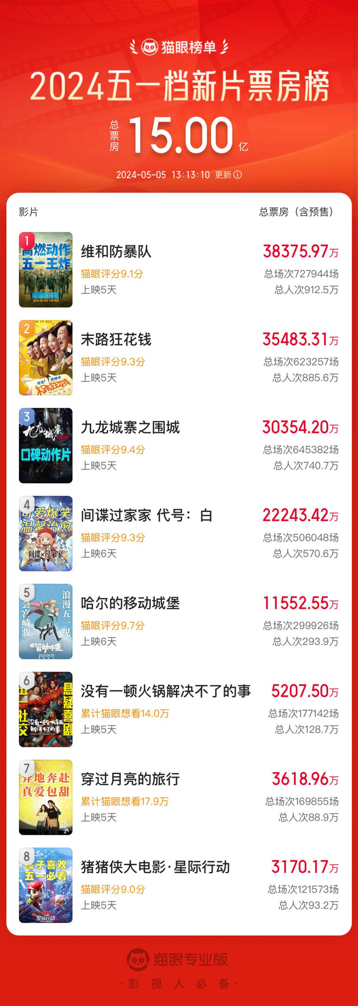 五一档新片总票房破15亿元 哈尔滨新闻网 哈尔滨人看哈尔滨事儿上哈尔滨新闻网 2024.05.0606:57 关注 据猫眼专业版数据,截至5月5日13时13分,2024年五一档新片总票房(含预售)破15亿!《维和防暴队》《末路狂花钱》《九龙城寨之围城》分列票房榜前三位。