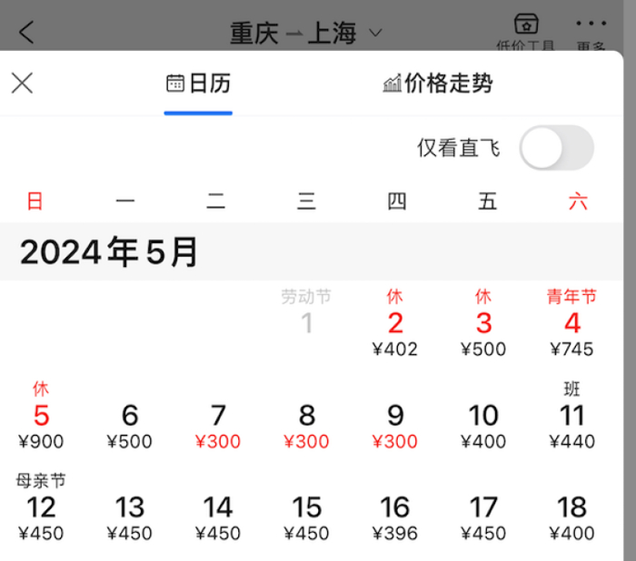 以重庆回上海的机票为例,根据票务平台的数据,5号时间合理的航班,价格均在1000元以上;即使6号,价格也基本都在八九百元左右,到了7号才恢复了比较常规的600多元。