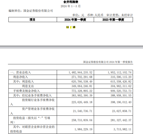 随着业务同质化严重,竞争激烈,券商行业马太效应早已显现。从2023年和2024年一季报来看,国金证券核心业务——投行业务、经纪业务都在承压。