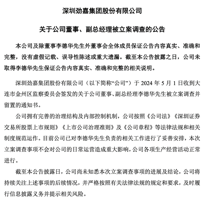 公告还显示,目前劲嘉股份已对李德华负责的相关工作进行了妥善安排,本次立案调查事项不会对公司的日常运营造成重大影响,公司各项生产经营活动正常进行。