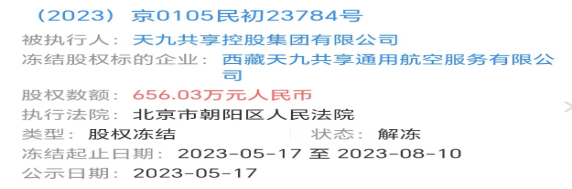 曾有财经融媒体平台发布“天九共享所持子公司部分股权被冻结以及关联多个诉讼案件”的文章,文中称,天九共享所持西藏天九共享通用航空服务有限公司656.03万人民币股权被北京市朝阳区人民法院冻结,期限自2023年5月17日至2026年5月16日,对应文书号为“(2023)京0105民初23784号”。