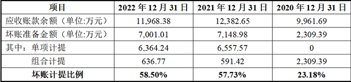 如上表,发行人报告期内虽然每年都有较为可观的应收账款余额,但报告期各年度应收账款计提的坏账准备金额同样相当“可观”,各年度金额分别2,309.39万元、7,148.98万元、7,001.01万元,坏账准备计提比例则分别为23.18%、57.73%、58.50%,其中绝大部分坏账金额系单项计提,具体原因主要是和境外客户发生诉讼而预计难以收回,而非一般企业常见的信用风险。