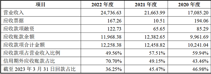发行人不仅产品结构老化,营收质量也在持续恶化。报告期内,发行人应收款项余额一直维持在相当高的水平,占当年度营业收入的比例分别为59.94%、57.51%、49.56%,几乎每年度都有近一半或一半以上的收入未能及时收回款项。与此相适应,发行人信用期外应收账款占比分别为43.46%、49.15%、70.70%,而期后回款占比从2020年度的46.98%一路下降至36.25%,客户整体回款情况处在急剧恶化态势。
