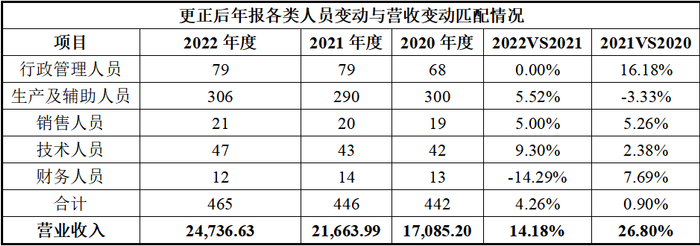 如上表,相较而言,尽管更正后的人员变动仍然与营收变动不完全匹配,但整体匹配度看起来平滑不少,整体变动趋势也确实基本一致。如更正前脱节最为严重的销售人员和技术人员,更正后的增长幅度虽仍低于营收增长幅度,但基本都保持了较为一致的增长势头。生产人员2021年度虽有小幅下滑,但报告期内整体上也是呈增长趋势,和营收的变动趋势差异不似更正前如此离谱。