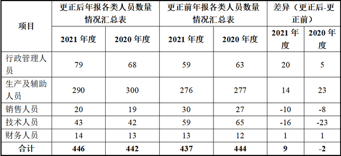 发行人不仅各个类别人员前后差距巨大,更为离谱的是,各年度人员总数竟然也存在差异。2020年度申报北交所时的人数较申报前少了2人,而2021年度申报北交所时的人数反而较申报前多了9人。