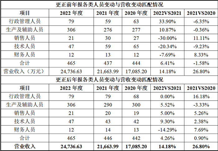 如上表,不难发现更正前的人员变动和营收变动几乎完全脱节,人员和业绩之间的变动趋势毫无相关性。例如与营收最直接相关的销售人员,更正前的人员变动比率分别为11.11%、-30.00%,而同期营收变动比率分别为26.80%、14.18%。在2021年度营收增长尚大幅快于销售人员增长速度的情况下,发行人2022年度立马就来了个大变脸,竟然在销售人员数量狂降30%的情况下实现了14.18%的营业收入增长。研发人员有过之而无不及,发行人竟然在研发人员持续大幅下降的情况下实现了营收的高速增长。生产人员虽不似那么夸张,但和营收变动同样不匹配。显而易见,如果按照更正前的人员进行申报,发行人完全无法向投资者解释营收增长的真实性与合理性。