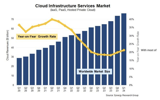 IT之家 5 月 6 日消息,市场研究机构 Synergy Research Group 上周发布了2024年第一季度云服务市场报告,其中显示大量企业正依靠云端服务,相较于去年同期,今年第一季度全球云服务市场增长了 21%,达到 765 亿美元(IT之家备注:当前约 5515.65 亿元人民币)。