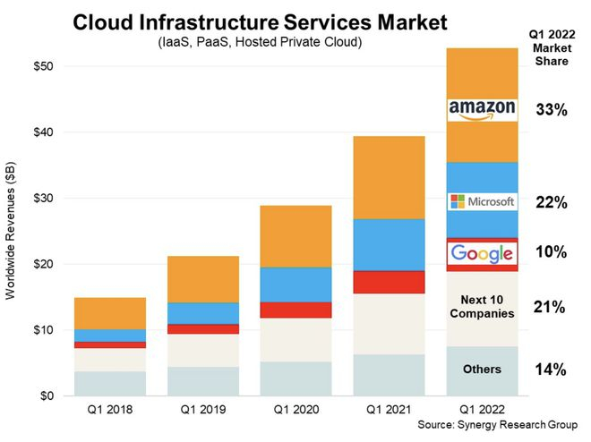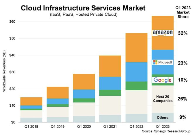 值得注意的是,虽然亚马逊目前仍是云服务市场龙头,但微软与谷歌的增长则更为强劲。参考该机构此前报道,2022 年第一季度时三者的市场份额以此是 33%、22%、10%,2023 年第一季度则是 32%、23% 与 10%,而如今相关差距变成了31%、25%、11%,显示亚马逊的市场份额正在微幅下滑,微软谷歌逐步进行追赶。