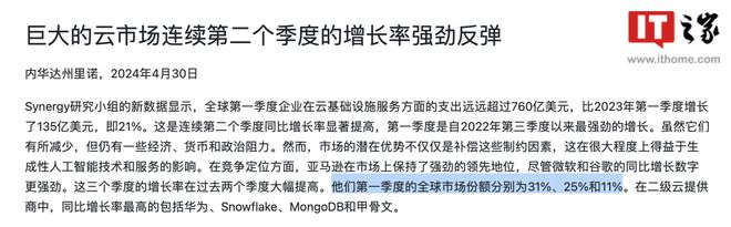 IT之家从报告中获悉,目前全球最大的云服务供应商为亚马逊AWS,市场份额为 31%;微软Azure位居第二,市场份额25%;谷歌排行第三,市场份额11%;