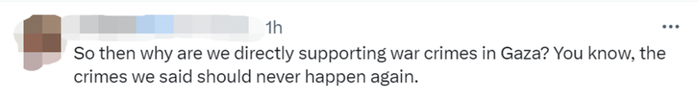 “那我们为什么还直接支持在加沙的战争罪行呢?你知道,我们说过的那些罪行不应该再发生。”↓