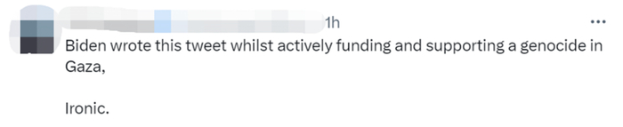 “拜登在积极资助和支持在加沙发生的种族灭绝的同时写了这则帖文,很讽刺。”↓