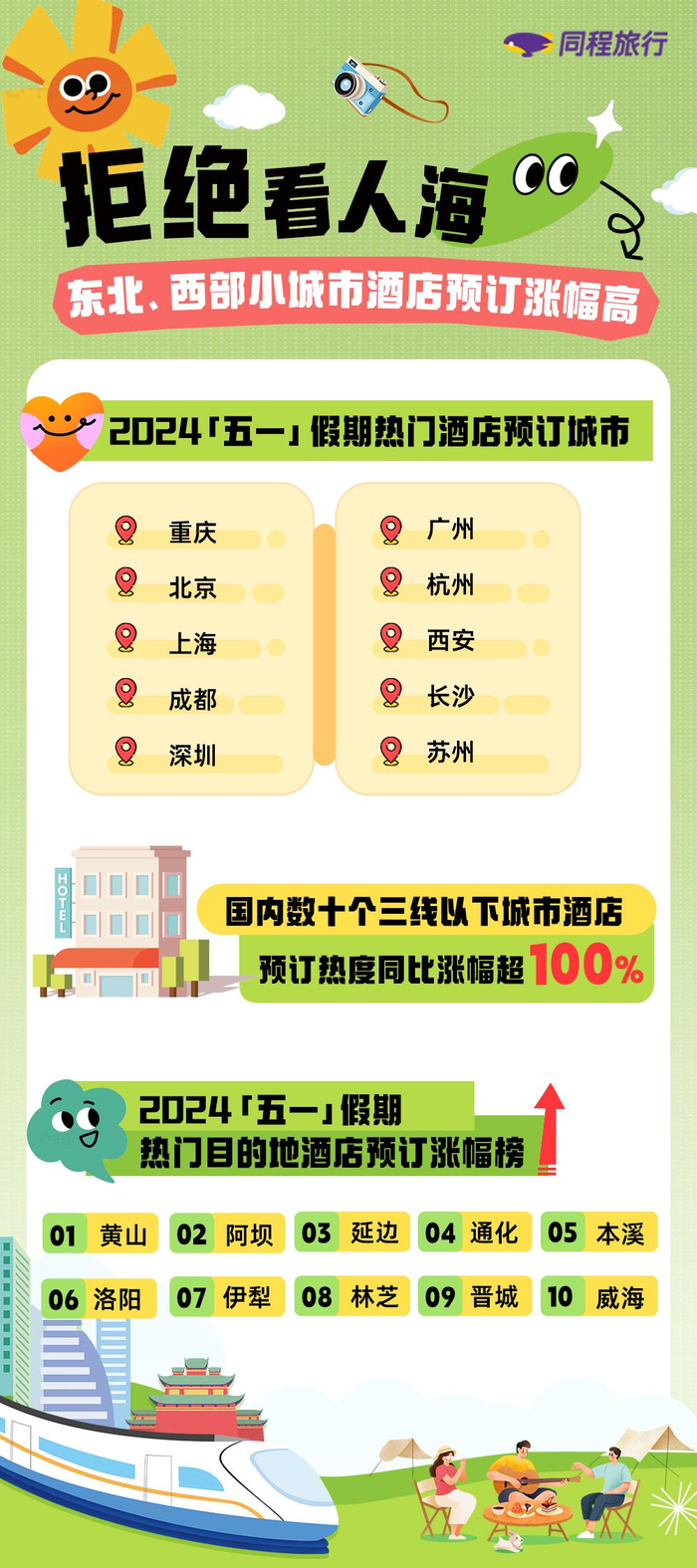 随着国内旅游市场发展,游客对于个性化、差异化的旅游体验需求也快速增长,年轻人开始探索更多的非传统目的地。社交媒体传播,也让人们更容易了解这些小城市的旅游资源和文化特色。同程旅行数据显示,国内热门目的地中,黄山、阿坝、延边、通化、本溪、洛阳、伊犁、晋城、林芝、威海等城市酒店预订热度增长最快。