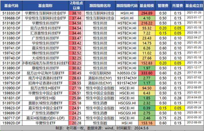 以下为2月1日低点至今,涨幅居前的港股类ETF基金。其中,华夏恒生互联网ETF(513330)涨幅高达38.1%,位居第一名。另外,华安恒生互联网ETF(159688)、华夏恒生科技ETF(513180)、易方达恒生科技ETF(513010)等几只产品的区间涨幅均超过34%,位居前列。下图中,老司基把管理费、托管费较低的产品标黄了。