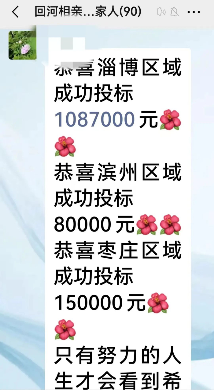 王自立自己有个100多人的客户群,名为“回河相亲相爱一家人”,他每天会在群内发布几条立金的宣传消息,有时是哪个区又投标了几十上百万元,有时是立金集团的早安分享。“除了靠谱,立金集团什么都给不了你”,他曾在群里发消息这样说。