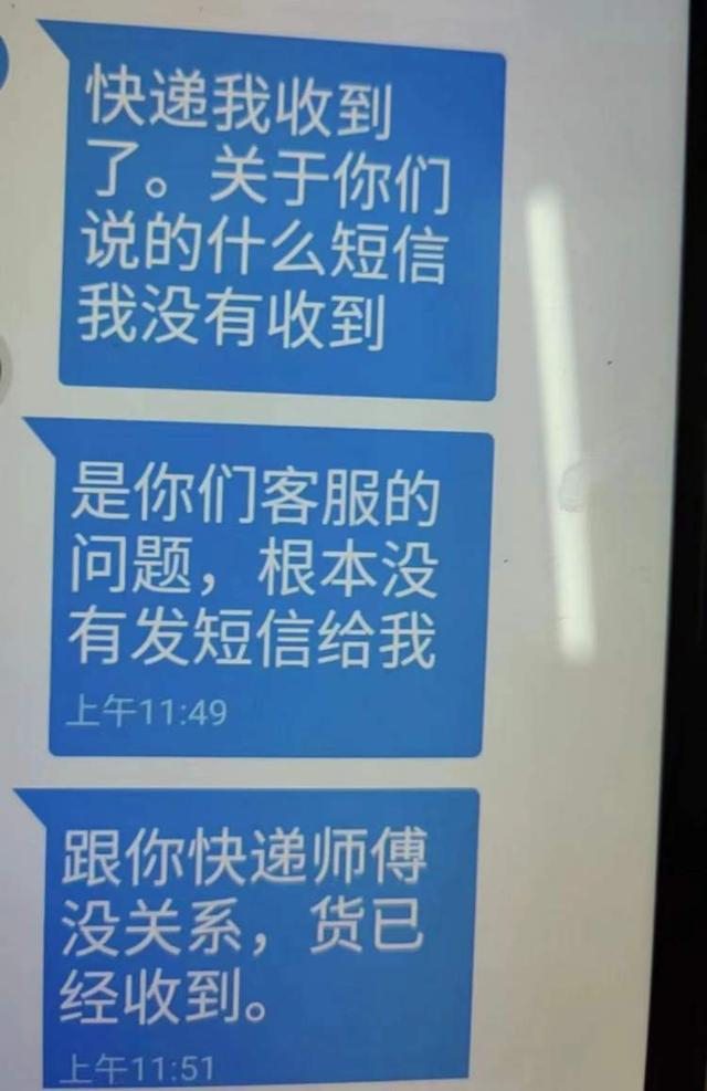 陈老板又打电话向当天的快递员确认,快递员表示,在客服与王先生妻子沟通失败后,自己曾致电沟通希望取消投诉。王先生妻子发短信向快递员解释,表示自己没收到短信,还安慰说这件事和快递员无关,快递员也就没再回复。