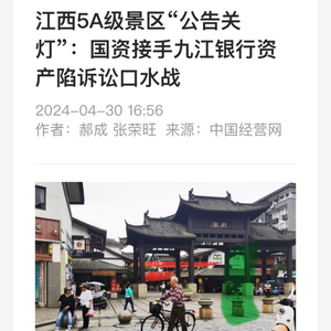 4月30日,《中国经营报》刊发稿件《江西5A级景区“公告关灯”:国资接手九江银行资产陷诉讼口水战》。