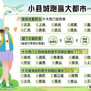 整个五一,“一亿人在XX”成了网友们用来形容五一集体出游盛况的热梗。与去年五一的爆发性出游相比,今年五一似乎有过之而无不及。不只是北京、上海、杭州等主要一线城市“人从众”现象,在“反向旅游”的热潮下,据携程数据,秦皇岛、威海、淄博、黄山、泰安等三、四线城市的旅游订单平均增长11%,而如安吉、桐庐、都江堰、义乌、婺源、景洪等县域小城的旅游订单更是平均增长了36%。