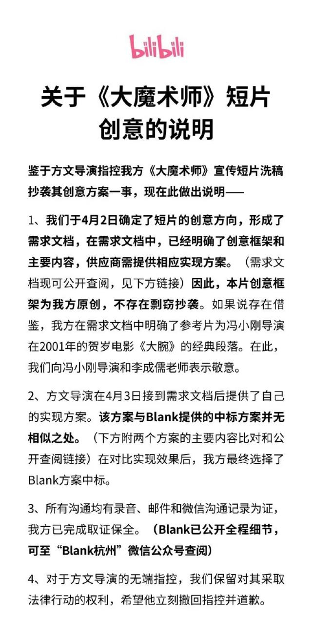 5月5日,哔哩哔哩《大魔术师》项目团队发布关于《大魔术师》短片创意的说明,回应涉嫌洗稿抄袭方文导演创意方案一事。项目组表示,短片的创意方向在4月2日就已经确定,短片创意框架为项目组原创,不存在剽窃抄袭。而方文导演提供的方案与中标方案并无相似之处,还要求方文导演立刻撤回指控并道歉。