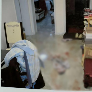 据徐女士提供的现场照片,徐园躺在地板上,鼻子下方和嘴部有斑驳血迹。徐园左胸处插着一把刀,身上的白色衣服被刀柄撑起,只遮挡了半边身体。衣服下摆被血迹染红,裸露的皮肤也有大片血迹。据警方取证照片,徐园生前倒下的地方在厨房和客厅之间,放着一条沾满血迹的白色浴巾。