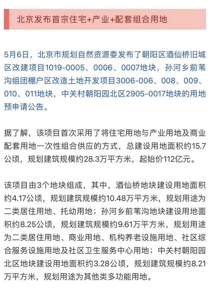 5月6日,北京市规划自然资源委发布了首宗住宅+产业+配套组合用地,该项目由3个地块组成,总规划建筑规模约28.3万平方米,起始价112亿元。