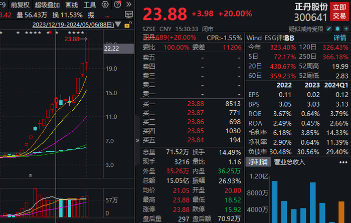 盘面上,正丹股份录得3天2板,报23.88元,该股4月以来股价累计涨超454%。