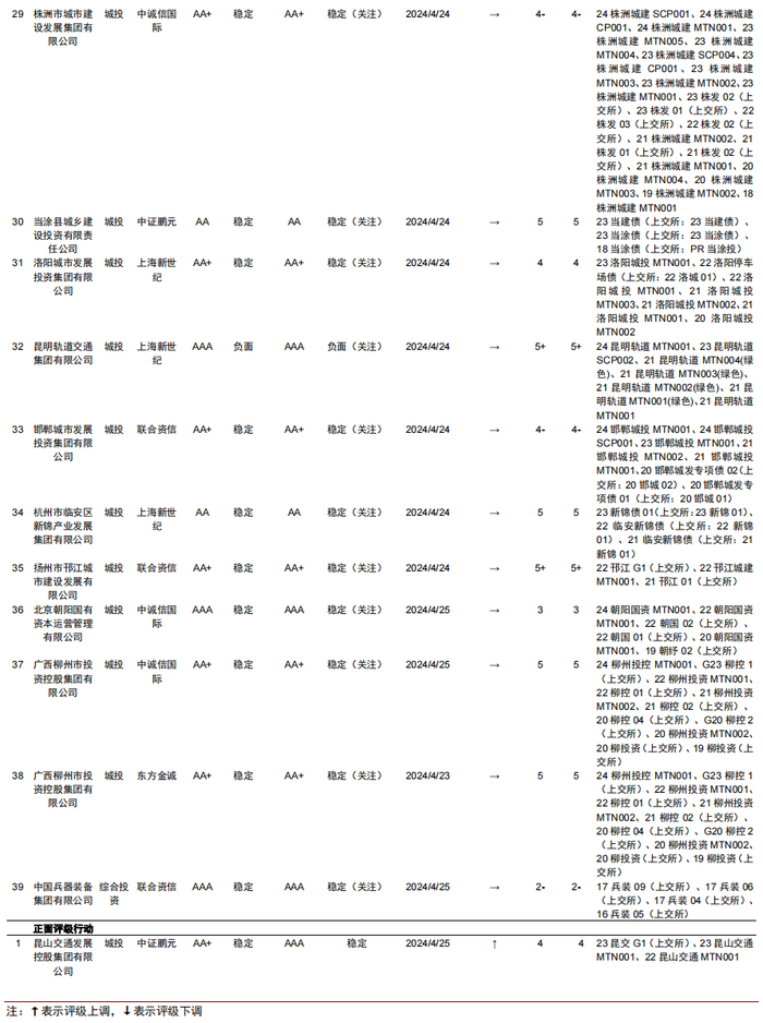本周评级行动共40项,其中共有关注行动39项,涉及1项中金评分调整:五河城投由5-上调至5;本周共有正面评级行动1项,不涉及中金评分调整。