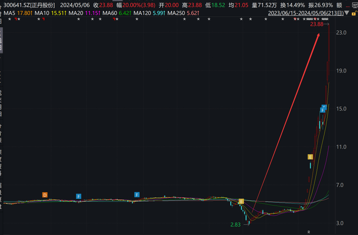 而就在5月6日,正丹股份尾盘涨停,股价不仅续刷历史新高,同时较年内低点累计上涨743.8%,成为年内首只7倍股。
