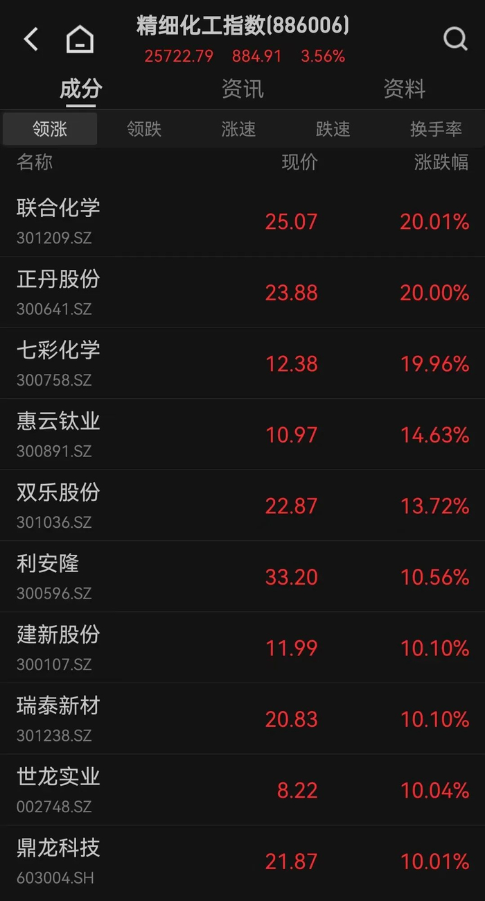 事实上,除了正丹股份,5月6日,整个精细化工板块迎来涨停潮,联合化学、七彩化学等纷纷涨停。