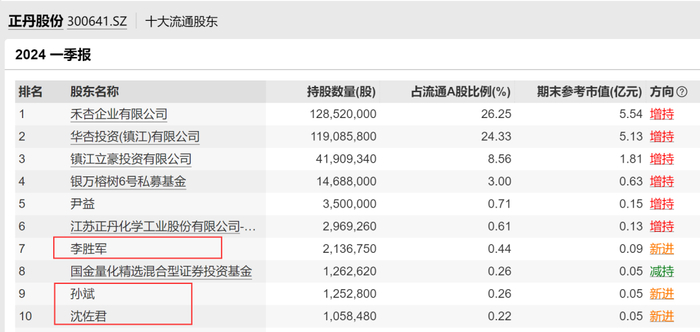 值得注意的是,4月27日正丹股份披露的一季报显示,今年一季度,李胜军、孙斌、沈佐君等三位自然人新进入前十大股东,持股数量分别为213.68万股、125.28万股、105.85万股。