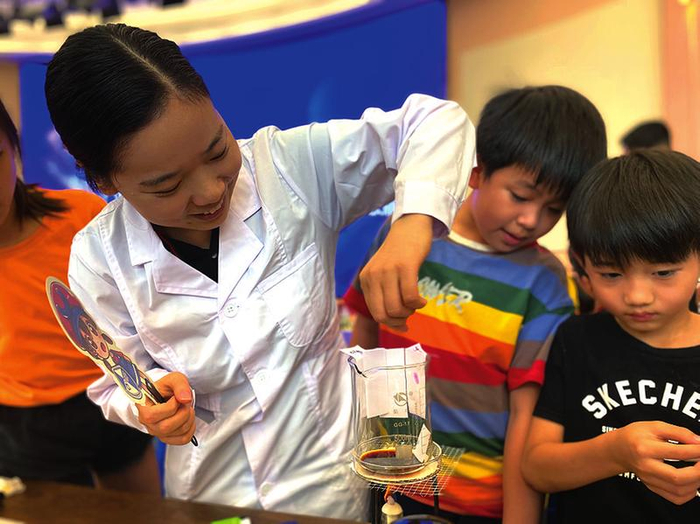 往前走,我们看到展厅中摆着各种类似麻花的东西,问了老师才知道,这个“大麻花”是DNA(脱氧核糖核酸)的双螺旋结构模型。工作人员介绍,试管中的DNA提取物看起来很像棉絮在水里的状态。基因是存在DNA里的一个小片段,是所有的生物都有的,但每个个体的基因又是独一无二的。它们就像一段严格编码的程序,每段复制的代码又与原程序存在细微差别。这就是为什么我们都和自己的父母有相似之处。在科学上,这种现象叫作遗传。在实验室里,我们通过测序方式将基因信息读取出来,获得方便存储和可计算分析的生物信息数据。在完成“存”和“读”后,这些基因数据还可以经过“写”的过程,就是利用基因合成与编辑技术进行基因组合成或编写,进一步探索生命本质并进行改造利用。