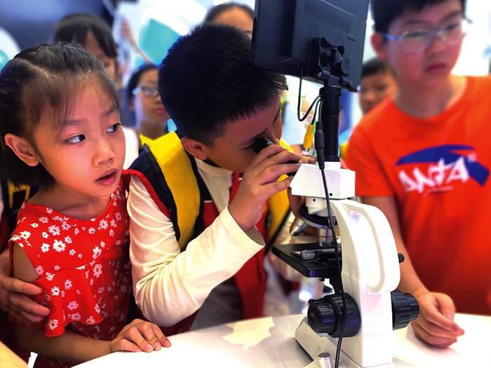 再往前走,我们来到了一个实验室,在这里可以看见身体器官是怎样工作的,还有身体各个器官的小模型。老师告诉我们:“要常吃瓜果蔬菜,才能让白细胞变强大。”看到旁边有小型显微镜,小记者们争先恐后地拥了上去,观察细胞的样子。