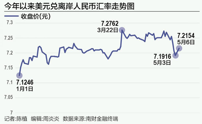 数据显示,“五一”假期期间,离岸人民币兑美元汇率从7.2312一路上涨至2月以来最高点7.1644,累计涨幅接近700个基点。