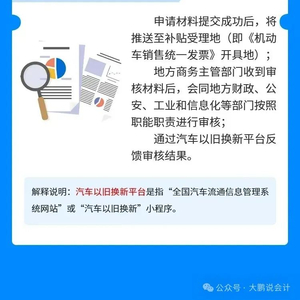 【前言】为了贯彻落实国家关于“推动消费品以旧换新行动方案”的要求,近期,商务部、财政部等7部门联合印发了《汽车以旧换新补贴实施细则》,明确了汽车以旧换新资金补贴政策。本期大鹏说说企业进行汽车以旧换新,会计人员需要关注的财税问题。