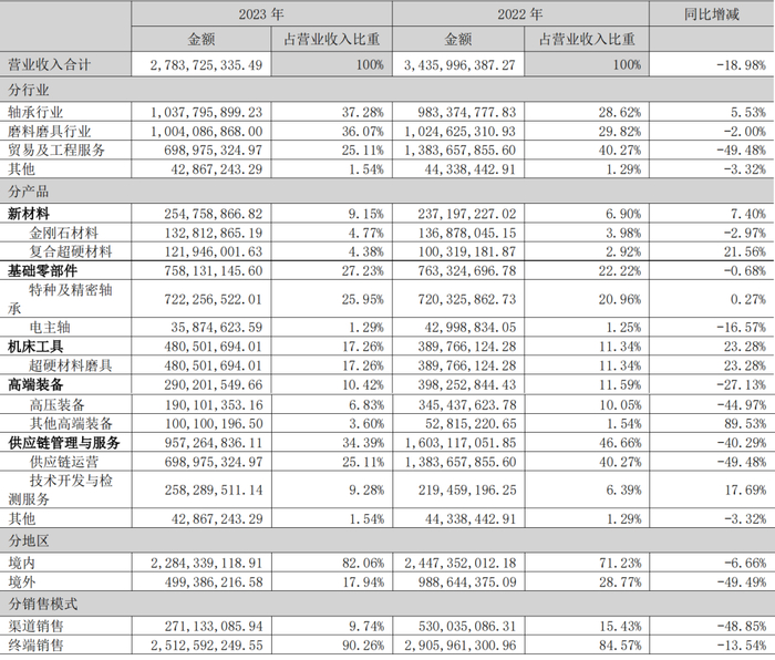 分业务:轴承业务毛利率39.52%,同比上升1.58个百分点;超硬材料业务毛利率38.54%,同比上升5.57个百分点;贸易业务毛利率12.2%,同比上升6.07个百分点。