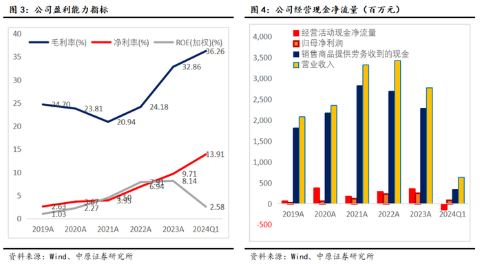 公司2024Q1毛利率、净利率分别为36.26%、13.91%,对比2023年报分别提升3.4个百分点、4.2个百分点。公司经营质量持续优化,盈利能力不断改善。