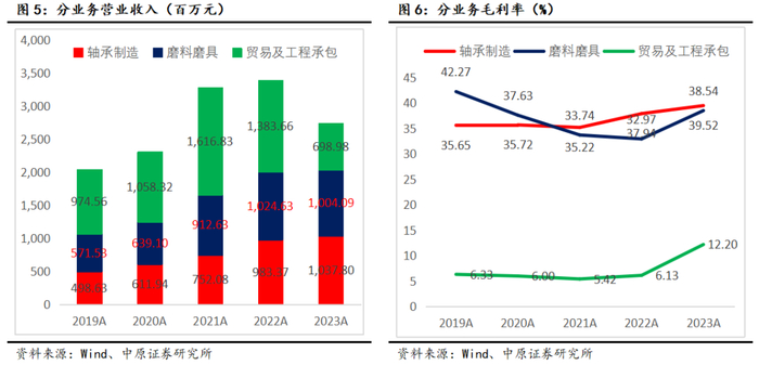 公司聚焦轴承和超硬材料双主业,不断压缩其他业务,剥离不良资产,不断提高经营质量。2023年公司贸易业务大幅下降49.48%,其中,光伏、铜等与主业无关的贸易业务规模大幅缩减。2023年12月公司公告浙江省龙游县人民法院已受理中浙高铁破产重整申请,中浙高铁持续亏损对公司带来的影响将有望彻底消除。