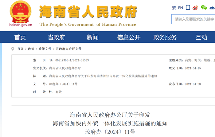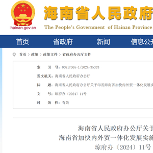 附:《海南省人民政府办公厅关于印发海南省加快内外贸一体化发展实施措施的通知》琼府办〔2024〕11号
