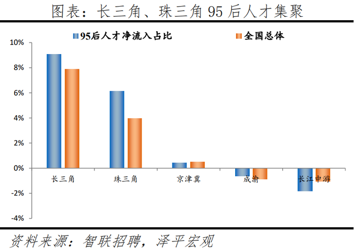 于是人口向东部迅速集聚,长三和珠三,人才净流入占比达到了18%,比全国总体流动人才要高。