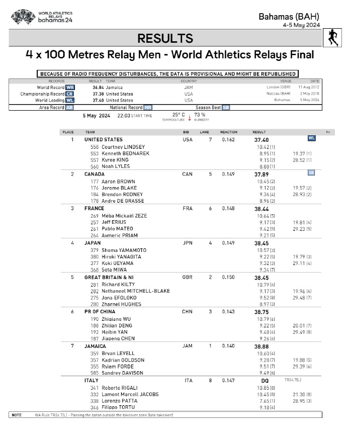 5日的决赛中,中国队由吴智强、邓智舰、严海滨、陈佳鹏组成的中国队跑出38秒75,在8支决赛队伍中排名第六。值得一提的是,男子100米亚洲纪录保持者苏炳添两轮比赛均未出场。