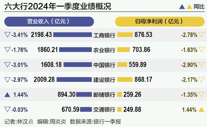 近日,六大行相继完成2024年一季度业绩披露。根据21世纪经济报道记者统计,六大行中,工商银行、农业银行、中国银行、建设银行等四家国有大行营业收入及归母净利润双降。